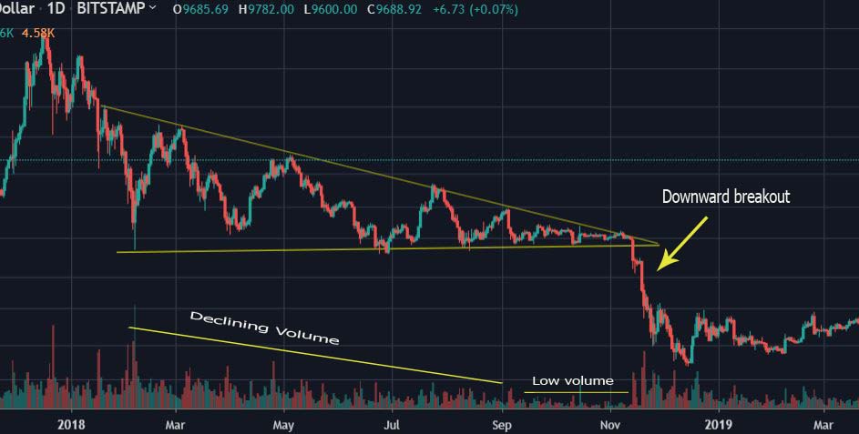 Kung sa bear market mabubuo ang descending triangle, 61% ang chance ng downward break out.