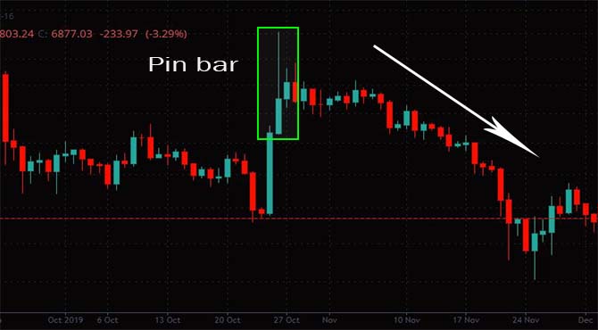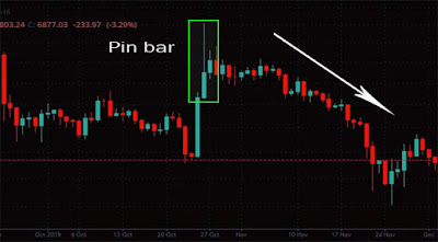 That is a good example of a daily pin bar na nangyari sa chart ng bitcoin. Kapansin pansin yung malaking bearish pin bar na di katagalan nag resulta sa downtrend.