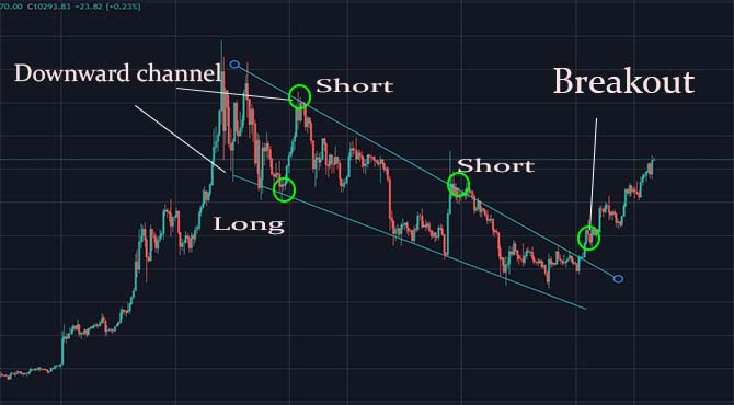 This example image is a BTC daily chart, other traders may look it as a falling wedge, but can be considered also as a diagonal channel.