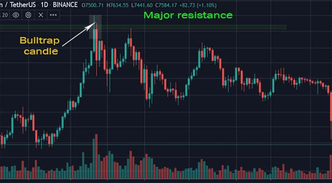 Ang image na nakikita natin sa itaas is a good example of a bull trap. May naghihintay na resitance level above, kaya naman nang tumama ang price dito the first candlestick that break the resistance level, pero sinundan ito ng isang bearish candle stick which is a sign of a reversal.