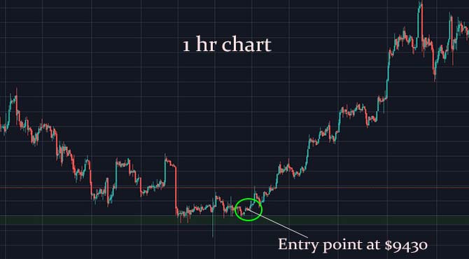 Hindi muna sya pumasok sa trade at naghintay muna ng any evidence of a reversal. Nakapag enter ng long position si trader 2 sa price level na $9430.